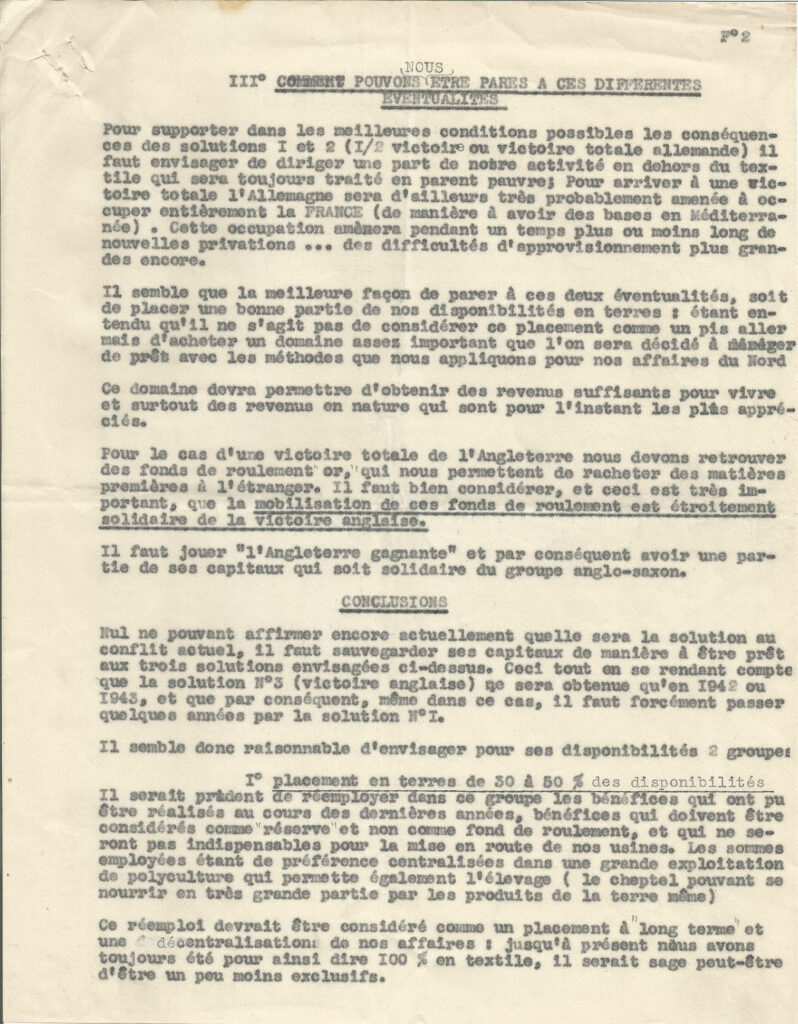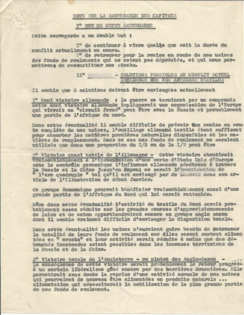 Cette note émane d’industriels du secteur textile. Elle n’est pas datée mais on peut la situer au début de la Seconde Guerre Mondiale. Il s’agit d’une note stratégique se donnant deux objectifs :